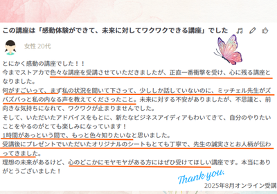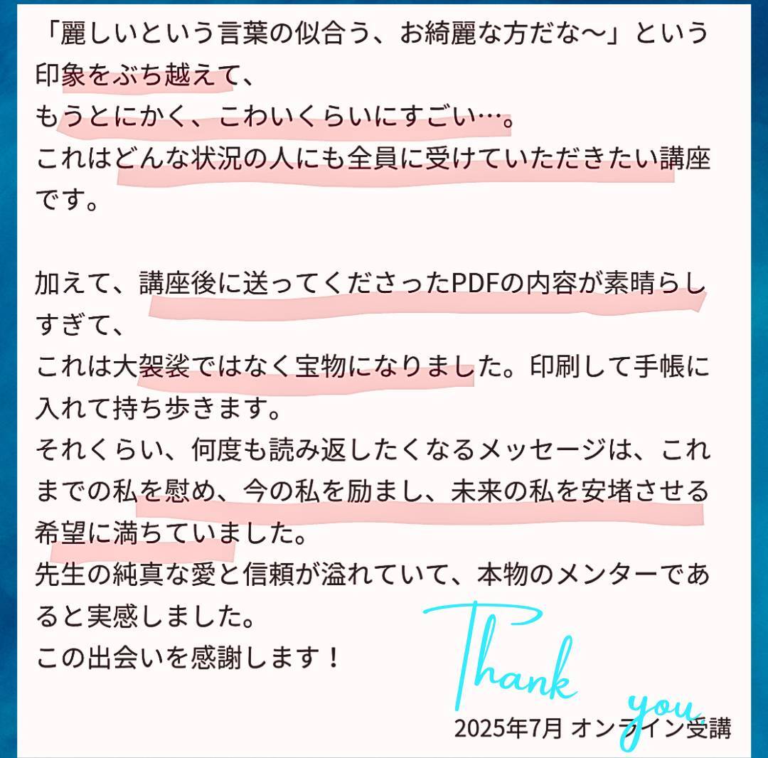 正直一番衝撃を受け、心に残る講座となりました。何がすごいって、まずは私の状況を聞いて下さって、少ししか話していないのに、 ミッチェル先生がズバッと内なる声を教えてくださったことに驚きました。