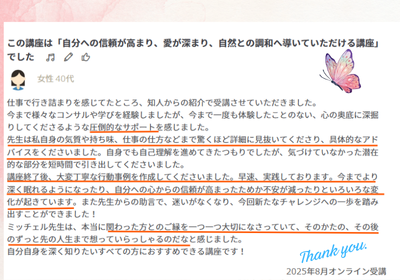講座終了後、大変丁寧な行動事例を作成してくださいました。早速、実践しております。今までより深く眠れるようになったり、自分への心からの信頼が高まったためか不安が減ったりといろいろな変化が起きています。また先生からの助言で、迷いがなくなり、今回新たなチャレンジへの一歩を踏み出すことができました!